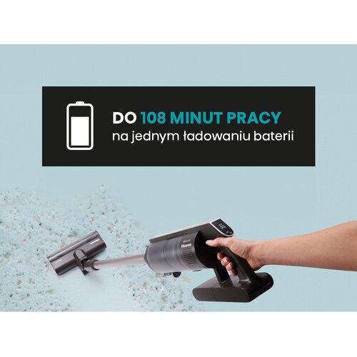 Zapomni o częstych przerwach na ładowanie! Długi czas pracy wynoszący 108 minut pozwala oczyścić całe mieszkanie bez przerwy. Potężny akumulator 25.2V zapewnia stałą moc ssania przez cały czas pracy – ostatnia zmiotka jest tak samo wydajna jak pierwsza. To oznacza mniej czasu spędzonego na sprzątaniu, a więcej czasu dla siebie i bliskich.